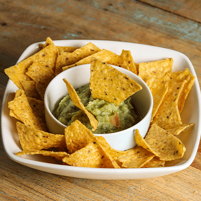 Nuestros Nachos con guacamole son el aperitivo perfecto, con guacamole fresco y nachos crujientes, ideales para compartir.
